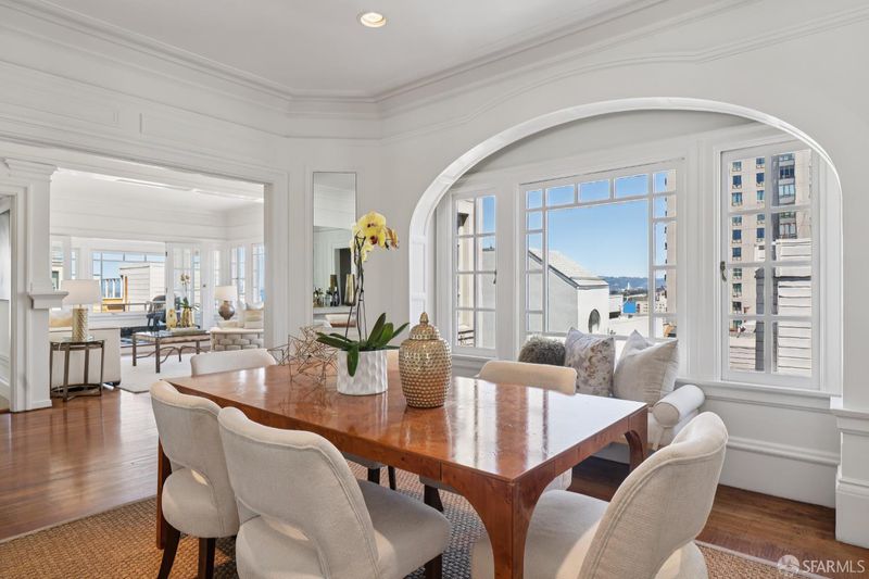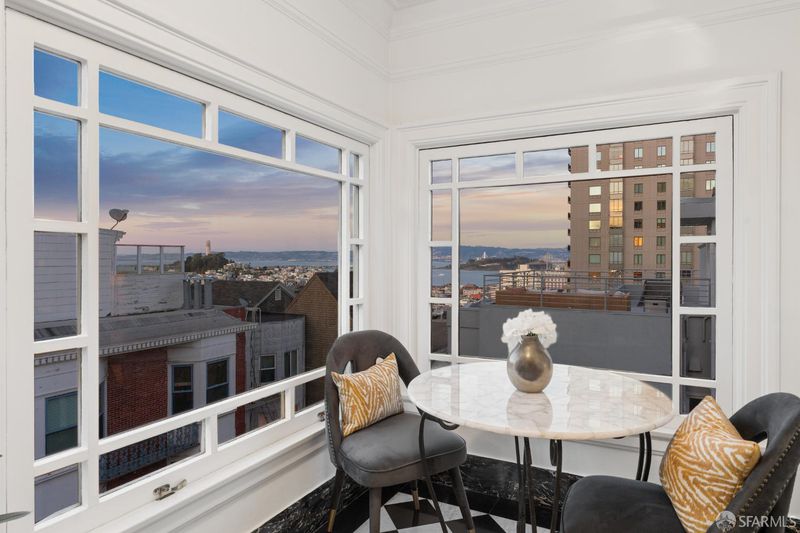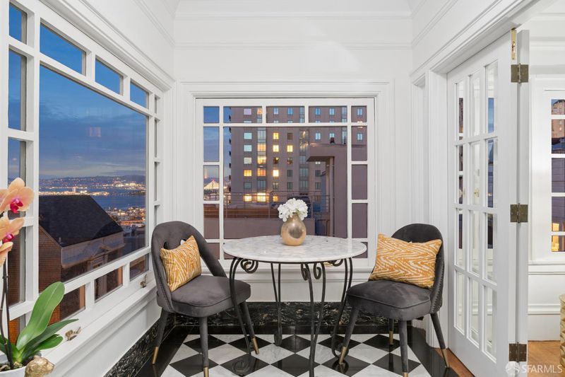 Crowning one of Nob Hill's most iconic boutique buildings, this enchanting one-bedroom, one-and-a-half-bath Beaux Arts penthouse with a sunroom perfect for a home office reads like a page from a Parisian architectural digest, steeped in old-world elegance yet perfectly attuned to San Francisco living. Ideally located on one of the City's most picturesque blocks, the residence reflects the refinement and proportion of classic European design while framing extraordinary San Francisco vistas Coit Tower, the Bay, and the Bay Bridge where the lights dance once again. This ever-changing panorama is equally suited to quiet mornings and sparkling evening gatherings. An inviting entrance gallery provides a lovely setting for art, leading to a generous and house-like scale sequence of rooms the foyer, living room, sunroom and dining room that flow seamlessly for both daily living and entertaining. Period moldings, hardwood floors, and expansive windows bring warmth and character while welcoming in abundant natural light and charming outlooks. The beautifully renovated kitchen is exceptionally gracious in scale, offering generous workspace and top-of-the-line appliances. The serene bedroom suite is a spacious retreat, complete with a beautifully renovated bathroom. A renovated powder room, additional storage, and parking for one large car or two small cars in tandem complete this special residence.