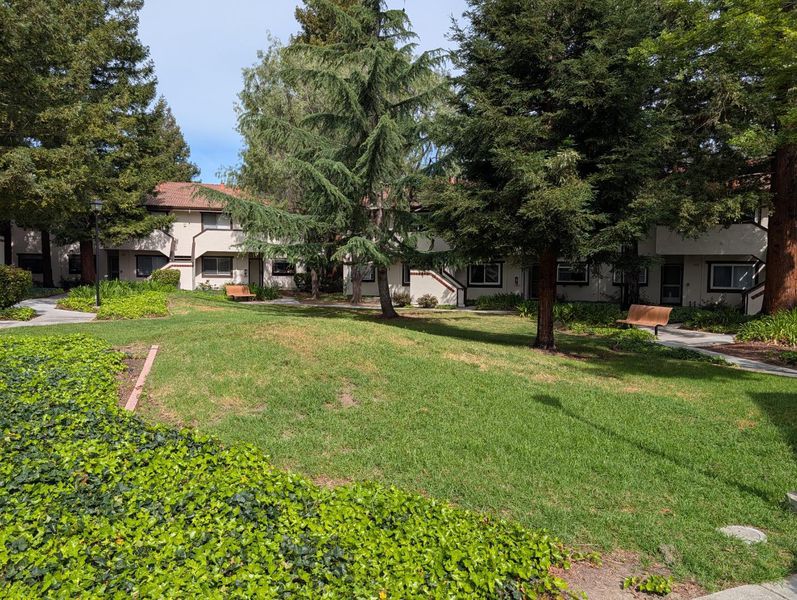 They say LOCATION, Location, location and this is it! Great central Silicon Valley location, wonderful commute location and a private and peaceful light and bright location. Welcome to this lovely top-floor retreat where natural beauty and modern comfort converge. This 2-bedroom, 2-bathroom residence lives remarkably large, with soaring vaulted ceilings and spacious rooms that amplify the volume of living and dining space for entertaining or relaxing. The updated kitchen enjoys a tranquil backdrop of redwood trees from the garden window - an unexpectedly meditative view to start (or end) each day. Morning light fills the front of the home with a gentle warmth, while sunset views serenade in the evening. Step outside the front door and a lush lawn area invites you to relax, read, or simply enjoy the quiet presence or the majestic redwoods. Within this secure, gated community a sparkling pool and spa offer an effortless extension of the lifestyle - a peaceful escape just moments from home. This top-floor haven delivers a rare blend of privacy, greenery and understated elegance.