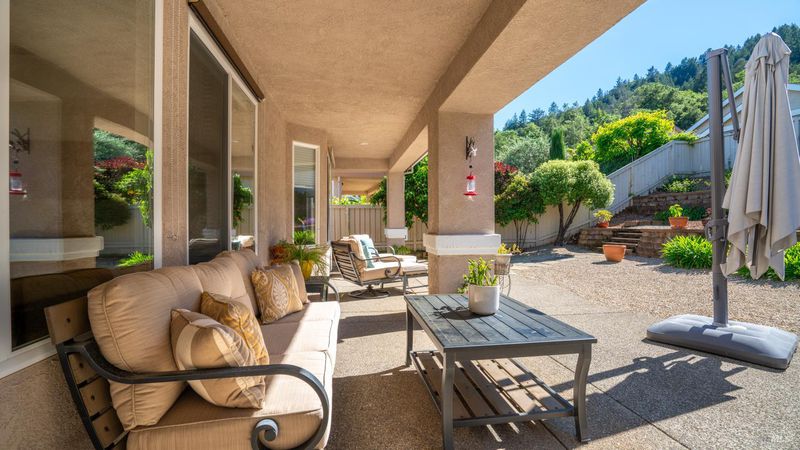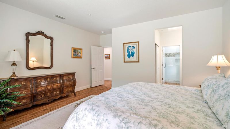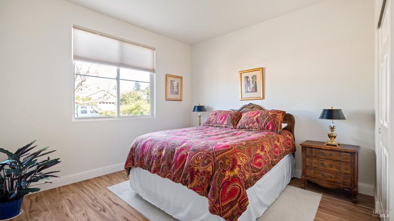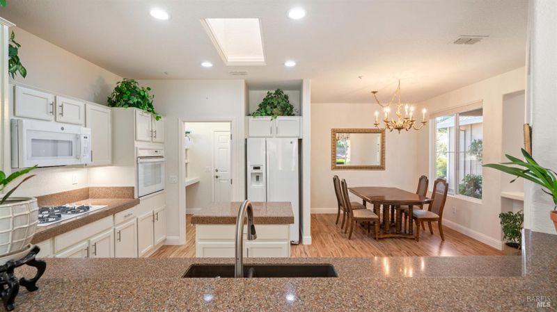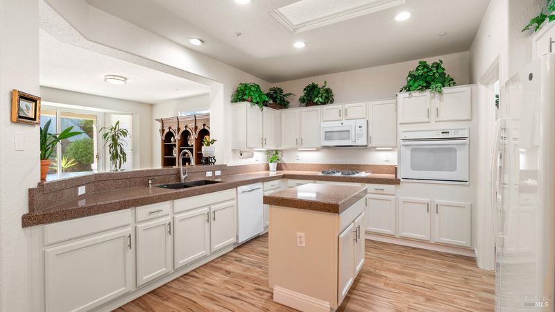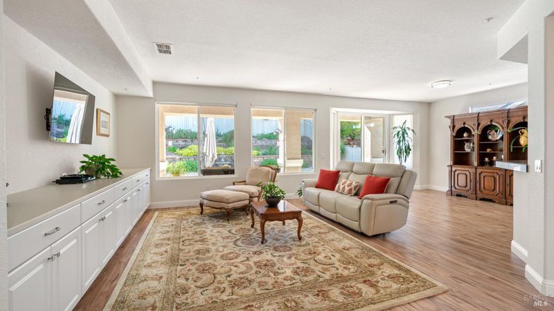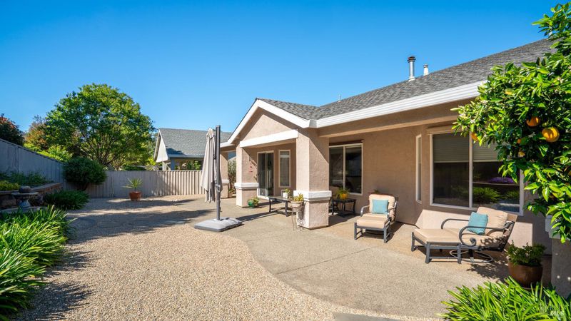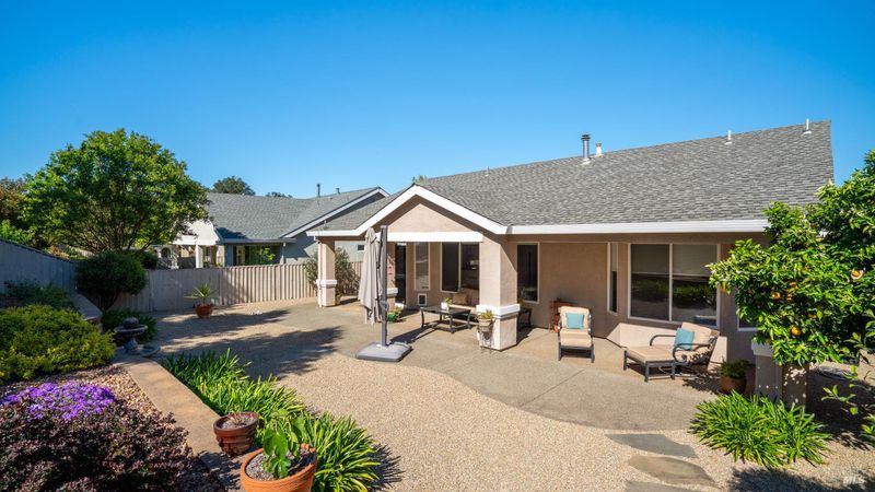 Located in the 55+ community of Clover Springs, this Calistoga model offers comfortable single-level living with a well-designed open floor plan and thoughtful updates throughout. With approximately 1,536 sq. ft., the layout is both functional and inviting, with spaces that work well for everyday living as well as visiting family and friends. Recent improvements give the home a fresh, cohesive feel, including painted interiors and cabinets, resurfaced countertops, luxury vinyl plank flooring throughout, refurbished blinds, updated lighting, and replaced bathroom fans. The kitchen opens comfortably to the main living area and includes granite countertops, ample prep space, and flows to the formal dining space. The primary suite has been updated with new bathroom counters and a remodeled walk-in shower, while the guest bath features updated fixtures. Additional improvements include new toilets, a bidet toilet seat, a new laundry sink, and added lighting in the garage. A former fireplace was removed to create a cleaner media center wall and a more functional living space. Outside, both the front and back yards have been improved with landscaping, drip irrigation, and weed cover for easier maintenance. The extended patio creates a welcoming outdoor area for relaxing, dining, or entertaining with mountains in the backdrop. Clover Springs residents enjoy access to a clubhouse, pool, spa, tennis courts, recreation area, and scenic walking trails, offering an appealing mix of activity and community.